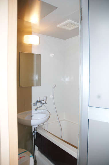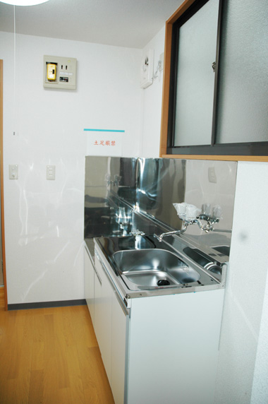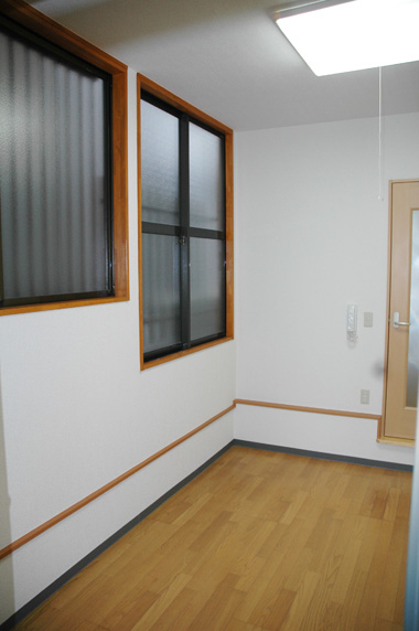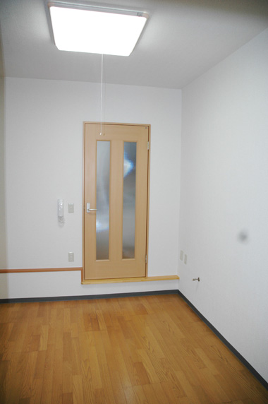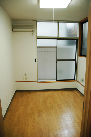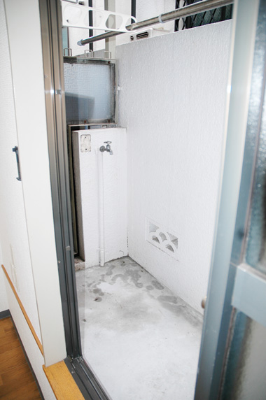 ベランダに洗濯機置場、クッションフロア、エアコン、照明器具付